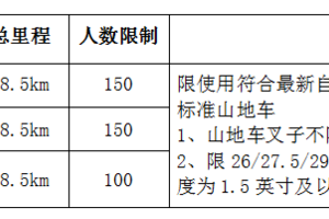 4、参赛车辆、头盔、装备、护具等自备,所用器材必须符合中国自协有关规定和组委会要求,否则不得参加比赛。赛前组委会将对参赛车辆进行资格检查,检查通过后方可参加比赛。即使是在赛后,一旦出现被裁判团核准的违规使用比赛器材的行为,该选手也将被取消比赛成绩。参赛队员和车辆须按规定佩戴组委会统一配发的号码布与车牌,不得裁剪,一经发现,取消成绩。车辆要求:山地车限26/27.5/29英寸车轮直径。轮胎宽度为1.75英寸及以上。