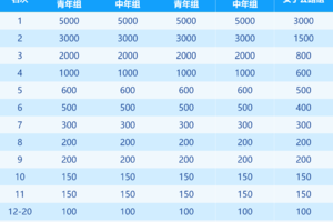 举例:参赛团队完成各组别比赛人数≥20人的团队,获得参与平分10000元奖金的资格。例如:有团队一和团队二,完成各组别比赛人数达到≥20人,则团队一:5000元、团队二:5000元。以此类推。