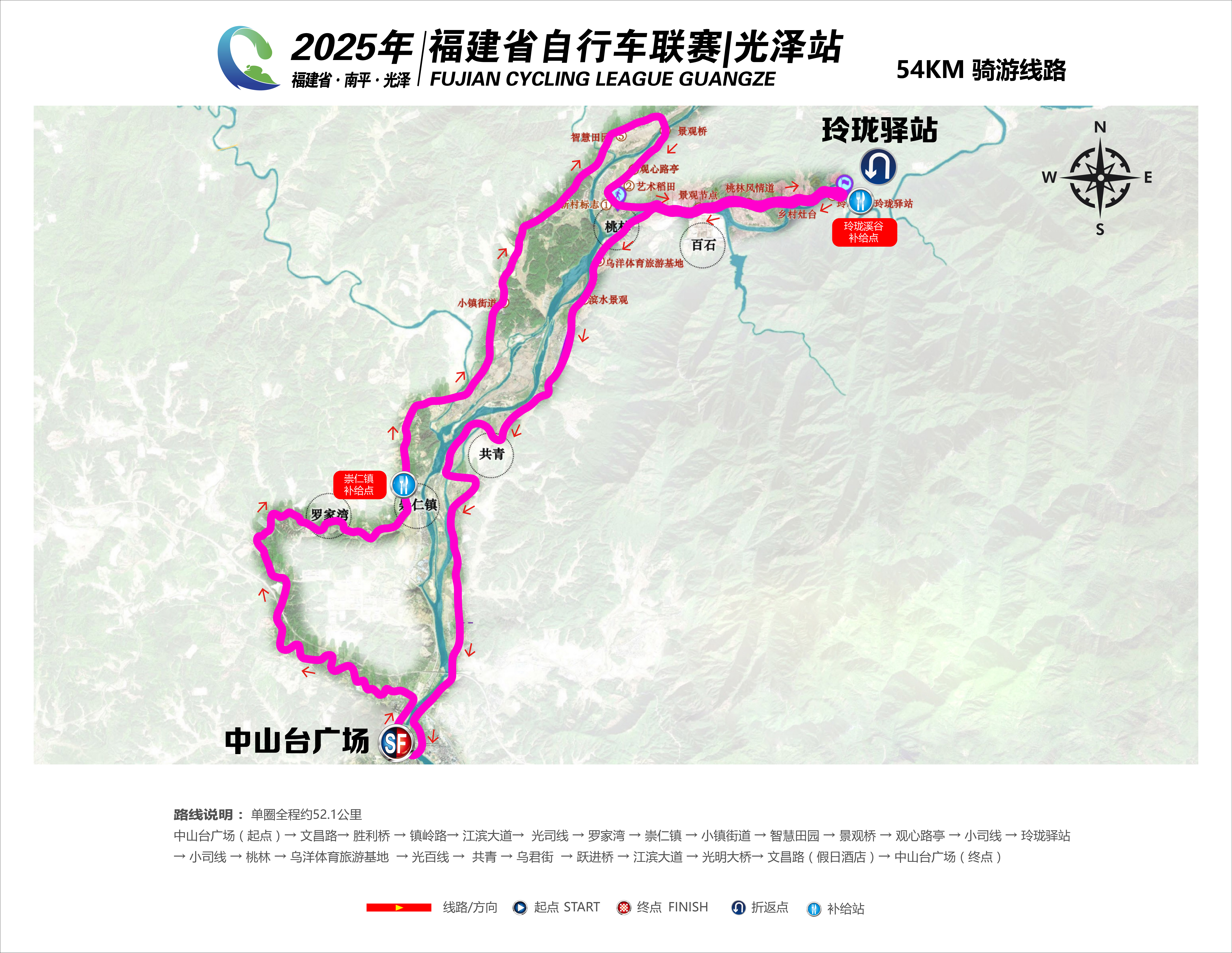线路描述:中山台广场(起点)→文昌路→胜利桥→镇岭路(欧沪大酒店)→江滨大道→光司线→罗家湾→崇仁镇(补水点)→小镇街道→智慧田园→景观桥→观心路亭→小司线→玲珑驿站(补给点)→小司线→桃林→乌洋体育旅游基地→光百线→共青→乌君街→跃进桥→江滨大道→光明大桥→文昌路(假日酒店)→中山台广场(终点),全程54公里。