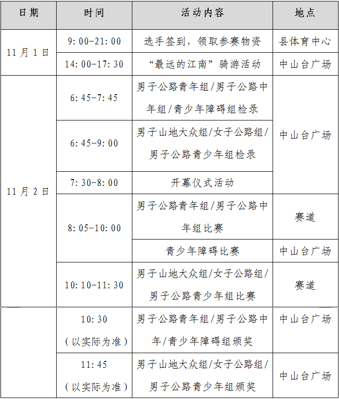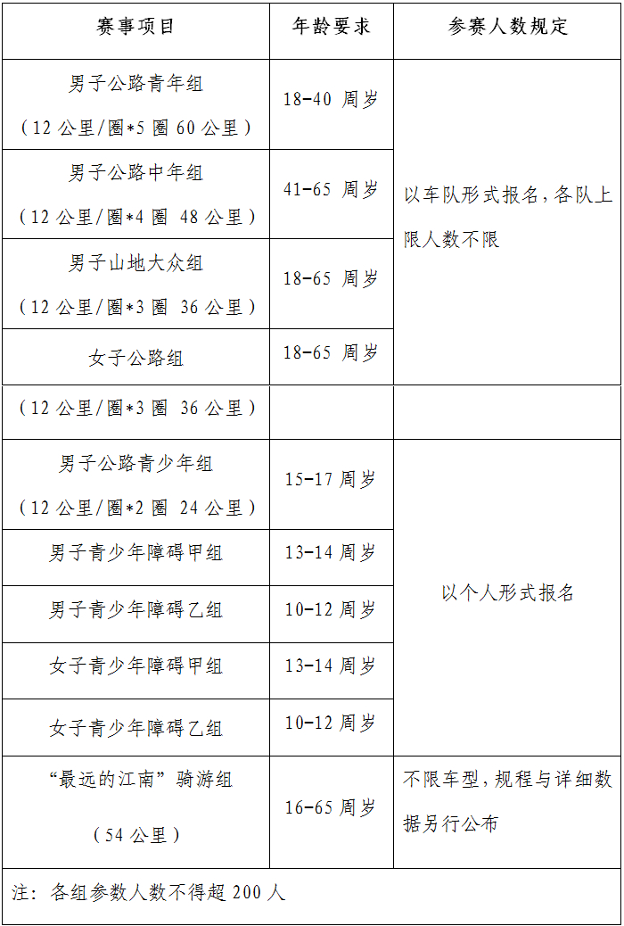 “最远的江南”骑游组:参赛运动员年龄须在16-65周岁,即出生于1960年11月1日至2009年10月31日之间。