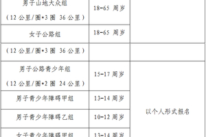 男子公路青少年组:参赛运动员年龄须在15-17周岁,即出生于2007年11月1日至2010年10月31日之间。