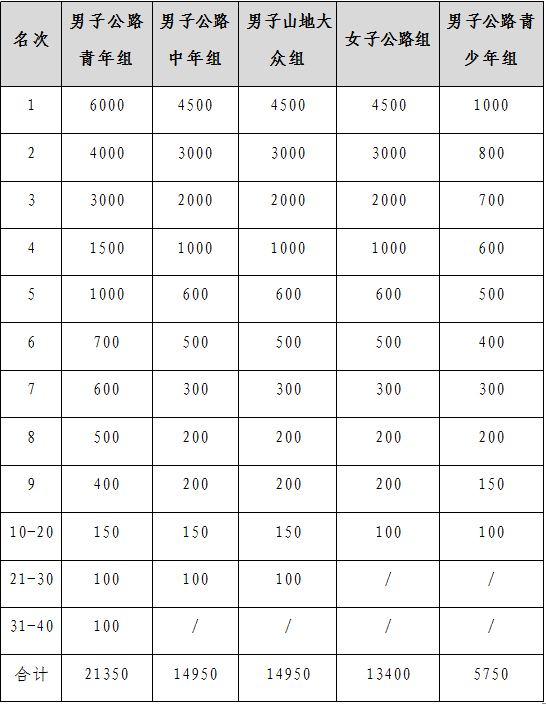 (2)分站奖励:各组别按规定录取人数(详见各组别录取名次人数表)并给予相应奖金,获得当日个人成绩前3名者参加颁奖仪式,领取奖金和证书。各分站公路青年组前10名的选手将分别获得11、9、8、7、6、5、4、3、2、1的积分奖励。